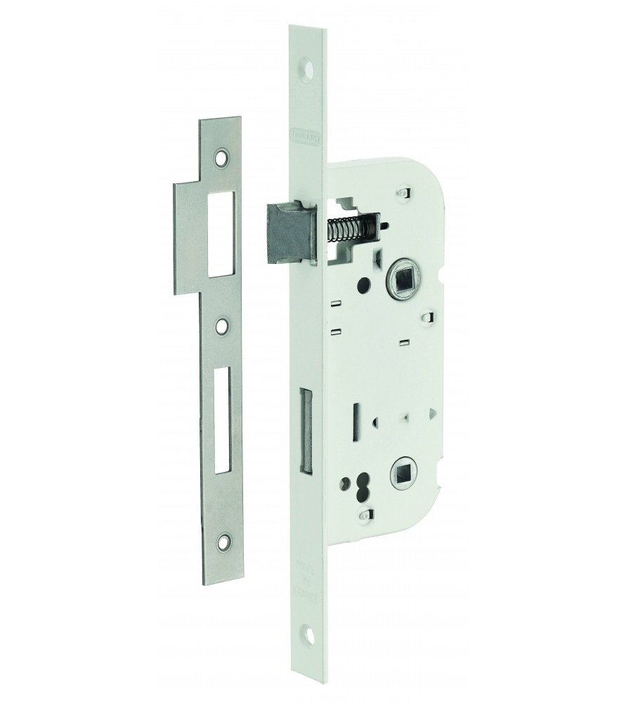 Zamek wpuszczany o osi 40/70 mm z blokadą - listwa kwadratowa biała