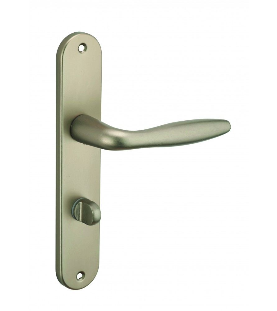 Zestaw klamek do łazienki/toalety Thalia z blokadą trzpień 7 mm rozstaw otworów 195 mm niklowany matowy