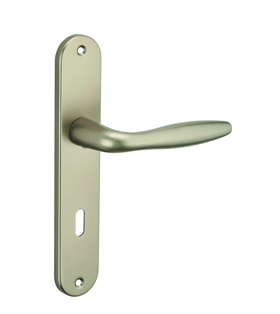 Zestaw klamek do drzwi pokojowych Thalia z otworem na klucz trzpień 7 mm rozstaw osi 195 mm niklowany satynowy