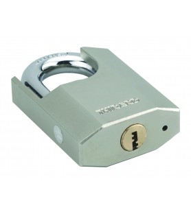 Laminowany korpus z ocynkowanej stali chroniony osłoną z PCV. Kabłąk z hartowanej stali zabezpieczony PVC. Podwójne zamknięcie kulowe ze stali nierdzewnej. Mechanizm pinowy. 2 niklowane klucze mosiężne.