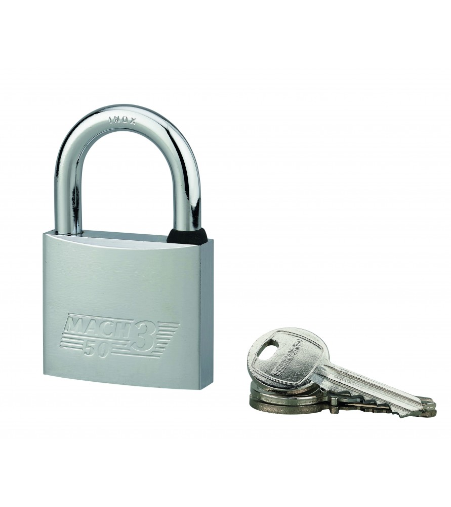 Laminowany korpus z ocynkowanej stali chroniony osłoną z PCV. Kabłąk z hartowanej stali zabezpieczony PVC. Podwójne zamknięcie kulowe ze stali nierdzewnej. Mechanizm pinowy. 2 niklowane klucze mosiężne.