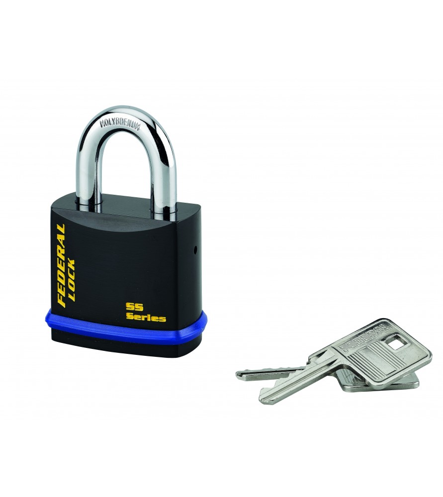 Laminowany korpus z ocynkowanej stali chroniony osłoną z PCV. Kabłąk z hartowanej stali zabezpieczony PVC. Podwójne zamknięcie kulowe ze stali nierdzewnej. Mechanizm pinowy. 2 niklowane klucze mosiężne.