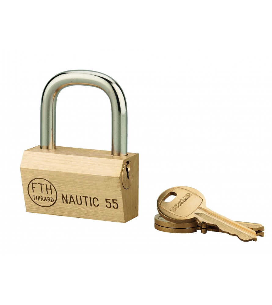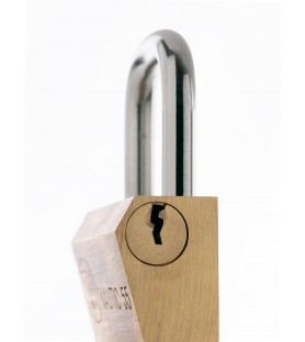 Lity mosiężny korpus. Kabłąk ze stali nawęglanej, niklowany. Zamek pinowy. Podwójne ryglowanie. 2 stalowe, niklowane klucze.