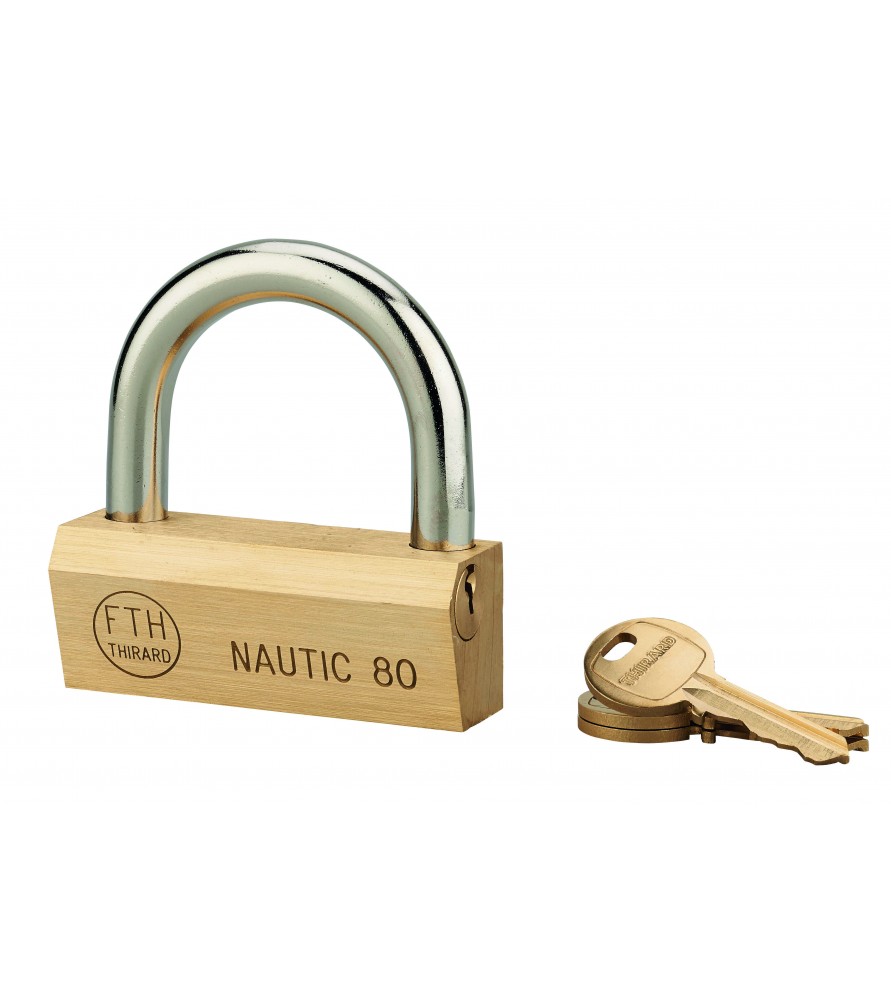 Lity mosiężny korpus. Kabłąk ze stali nawęglanej, niklowany. Zamek pinowy. Podwójne ryglowanie. 2 stalowe, niklowane klucze.
