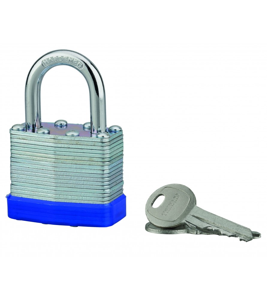 Jednoczęściowy korpus z mosiądzu. Stalowy uchwyt niklowany. Ochrona przed uszkodzeniem i zaczepieniem dzięki 2 stalowym bolcom. Prosta blokada. 2 klucze.