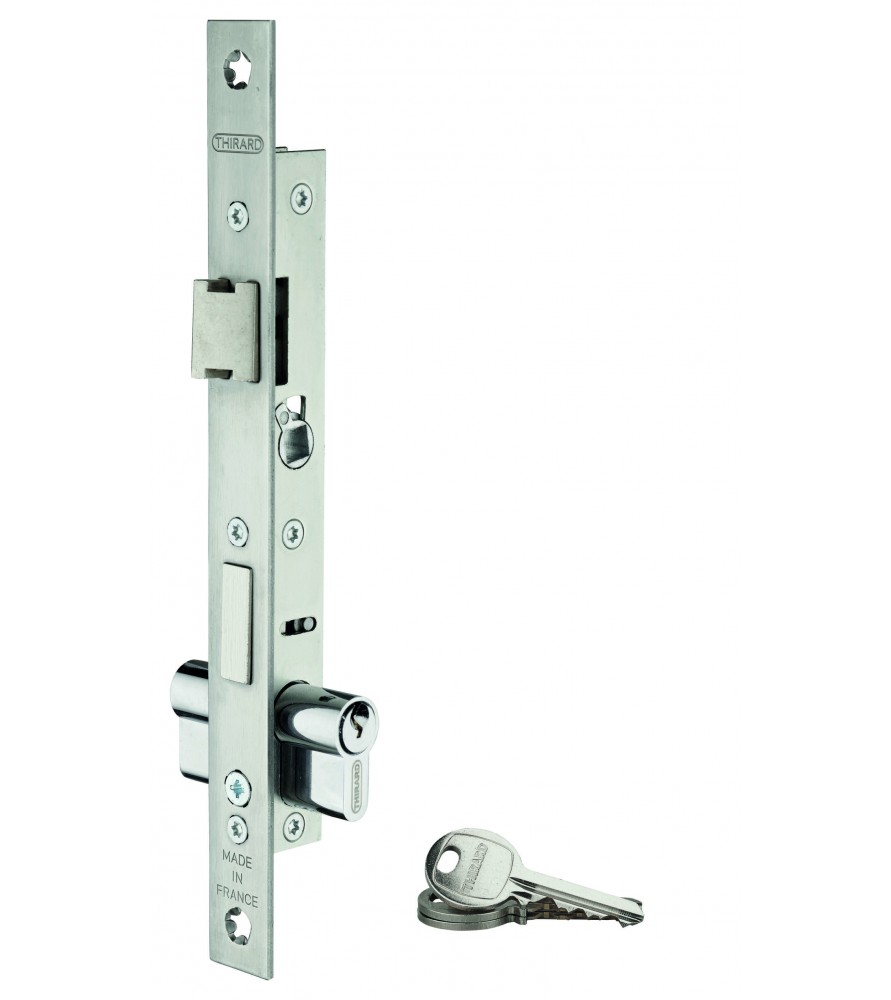 Obudowa stalowa. Blaszka czołowa ze stali nierdzewnej. Odwracalny zatrzask bez demontażu zamka. Niklowany rygiel. Płaska blacha zaczepowa ze stali nierdzewnej. Trzpień 8 mm z tuleją redukcyjną 7 mm. Rozstaw osi 70 mm. Wykończenie: Ocynkowana.