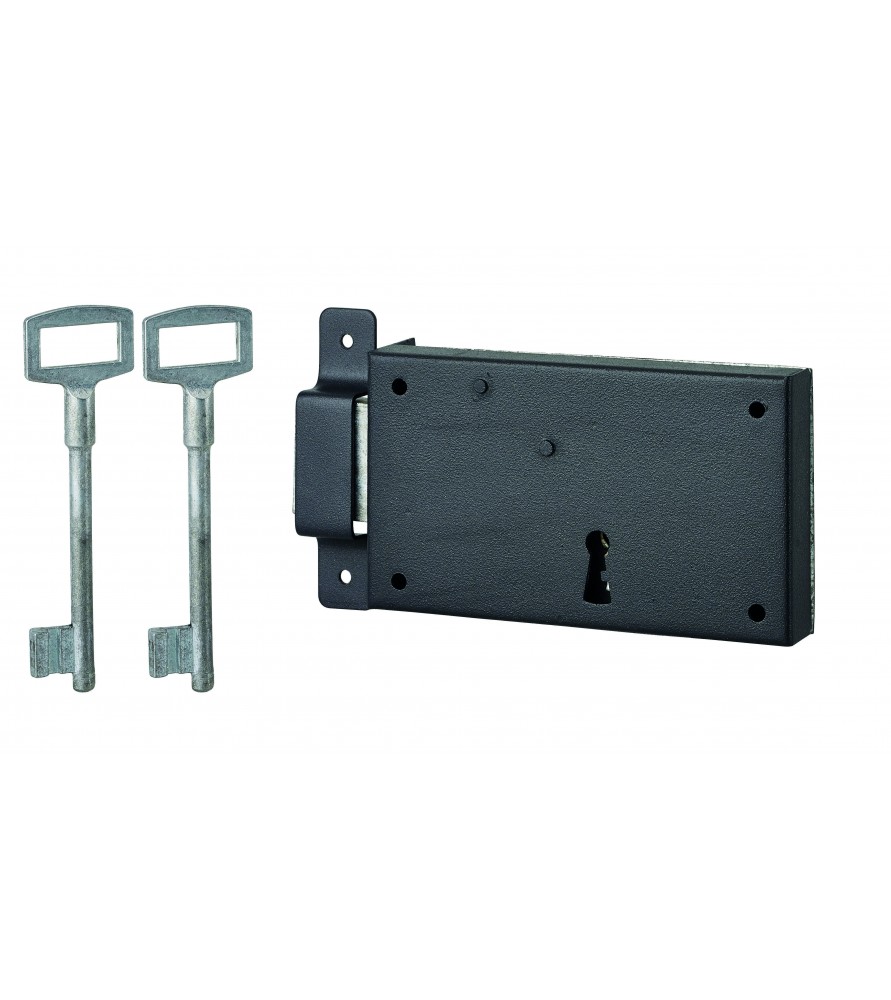 Zamek poziomy nakładany na drzwi do piwnicy tylko rygiel lewy oś 80 mm 140x80 mm czarny 2 klucze