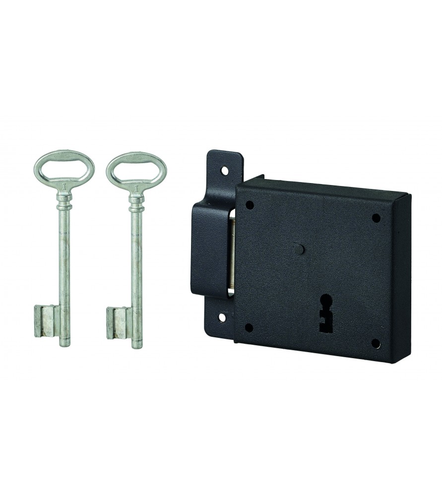 Zamek poziomy nawierzchniowy na klucz do drzwi piwnicznych tylko rygiel lewy oś 50 mm 85x76 mm czarny 2 klucze