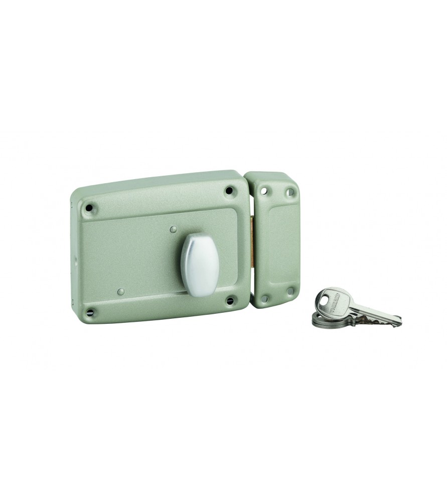 Zamek posiada przyciskowy mechanizm otwierania od wewnątrz oraz funkcję blokady obsługiwaną pokrętłem, dzięki czemu użytkownik ma pełną kontrolę nad dostępem. Od zewnątrz wyposażony jest w ergonomiczną klamkę PVC, odporną na warunki atmosferyczne.