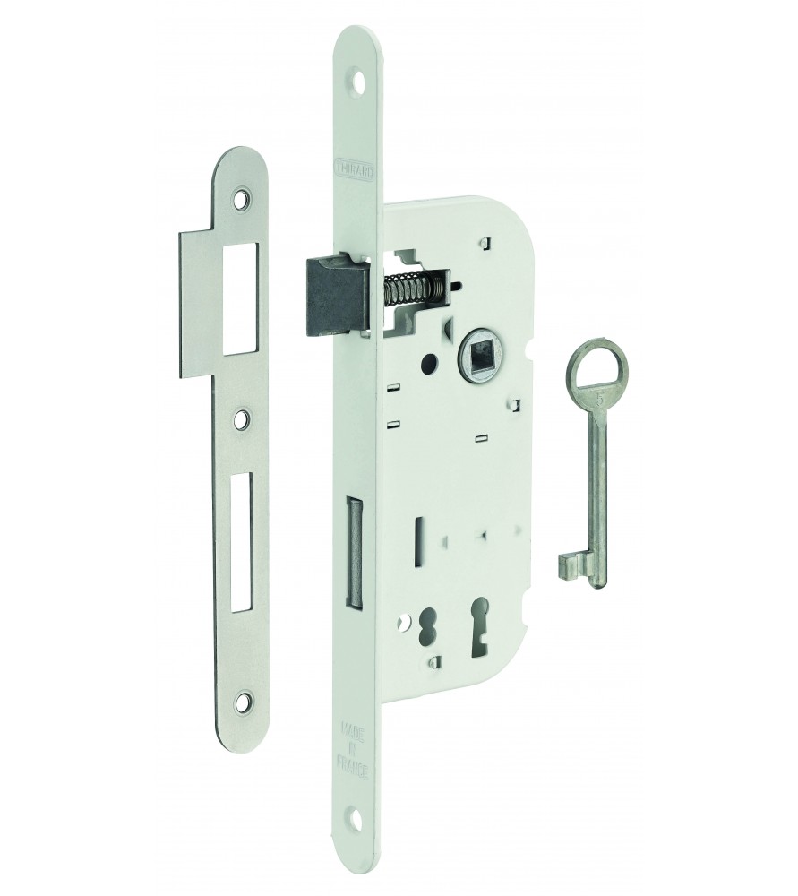 Zamek wpuszczany na klucz do drzwi pokojowych oś 40 mm zaokrąglone końce 1 obrót biały 1 klucz