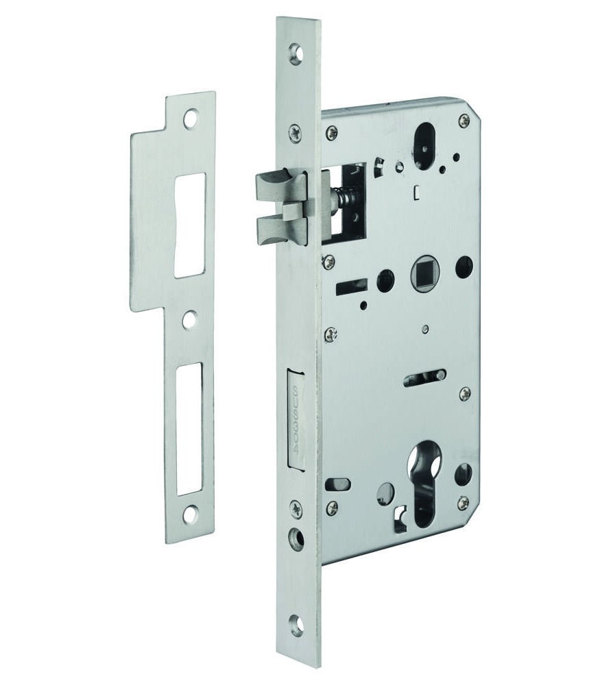Kasetka ze stali giętej. Stalowe czoło z zaokrąglonymi końcami. Zapadka półobrotowa ze stopu metali. Poliamidowy orzech. Zapadka ze stopu metali. 2 obroty, zapadka półobrotowa otwierana przez pół obrotu kluczem. Trzpień 8 mm. Stalowa zasuwka kątowa.