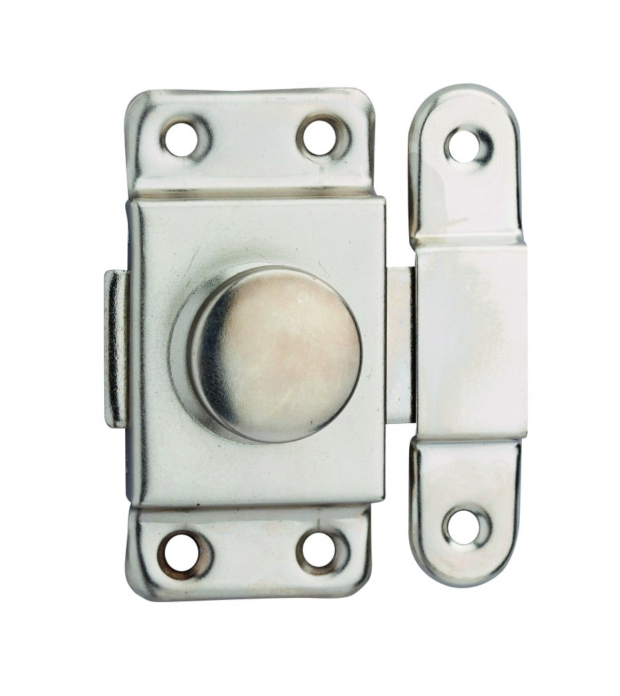 Zasuwka meblowa ze stali ocynkowanej. Płytka mocująca ze stali giętej. Obejma ze stali giętej. Zaokrąglony uchwyt. Okrągły, przesuwny rygiel.