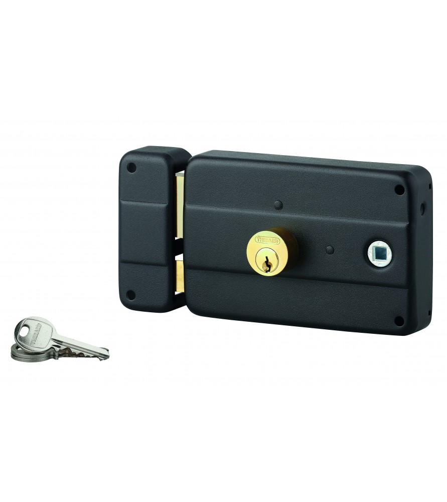 Korpus i zaczep stalowy tłoczony. Rygiel mosiężny, półrygiel mosiężny. Mechanizm trójobrotowy. Automatyczny powrót półrygla po przekręceniu klucza. Podwójny cylinder mosiężny z 5 zapadkami, długość 45 mm. Trzpień 6 mm. Wejście klucza i trzpienia stalowe. 3 niklowane klucze.
